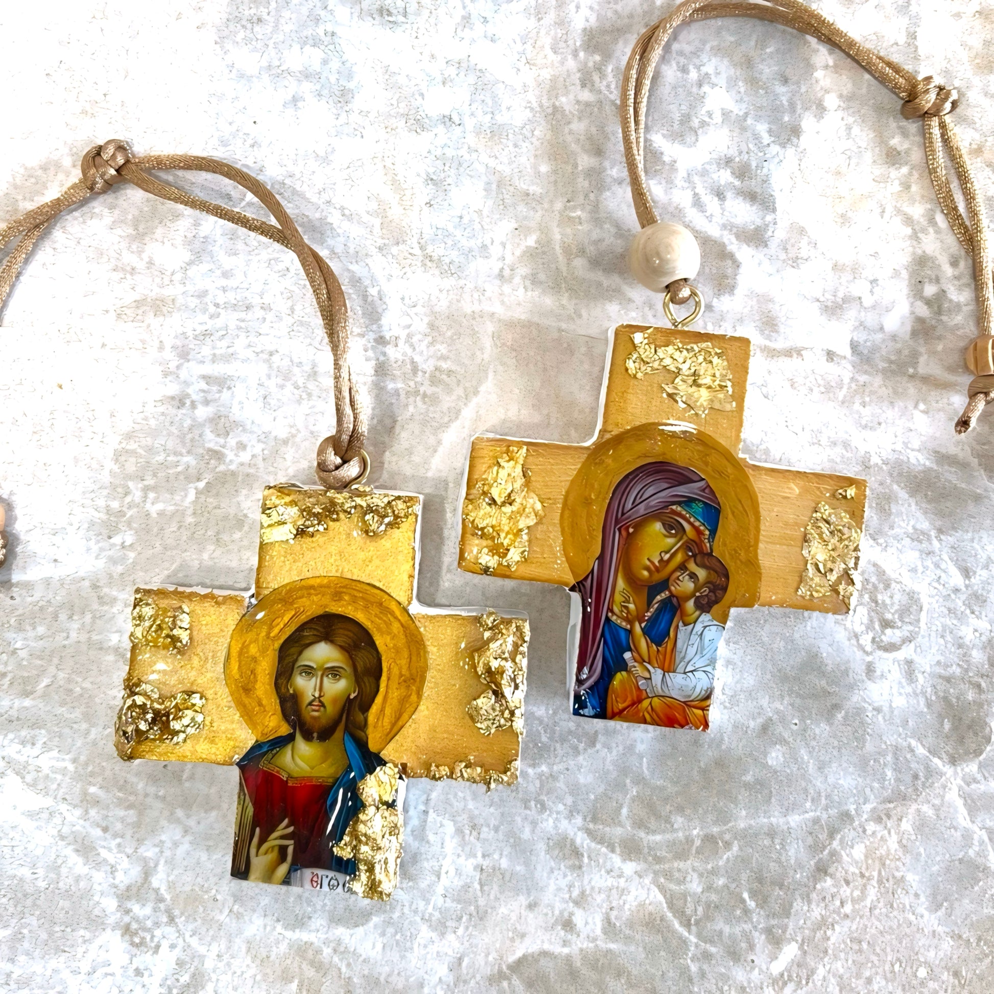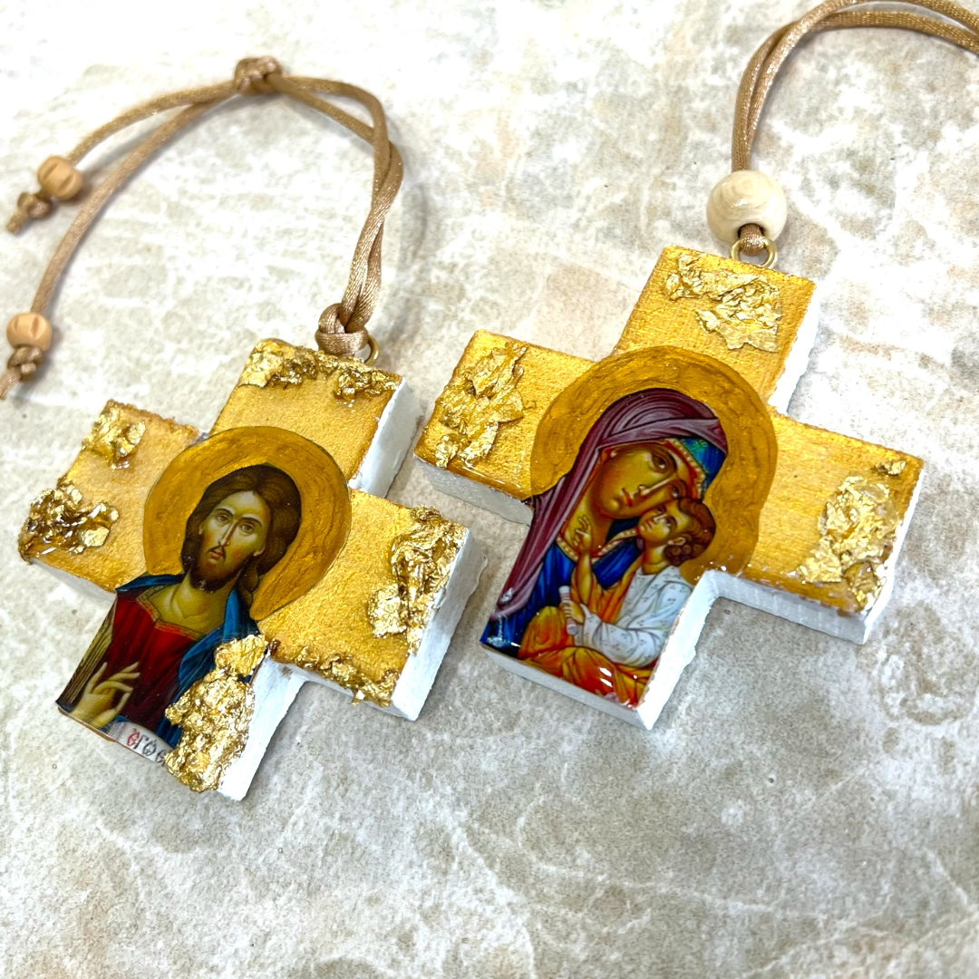 Easter edition miniature handmade crosses with icon images of Mary & Jesus depicted on a timber cross with gold leaf.